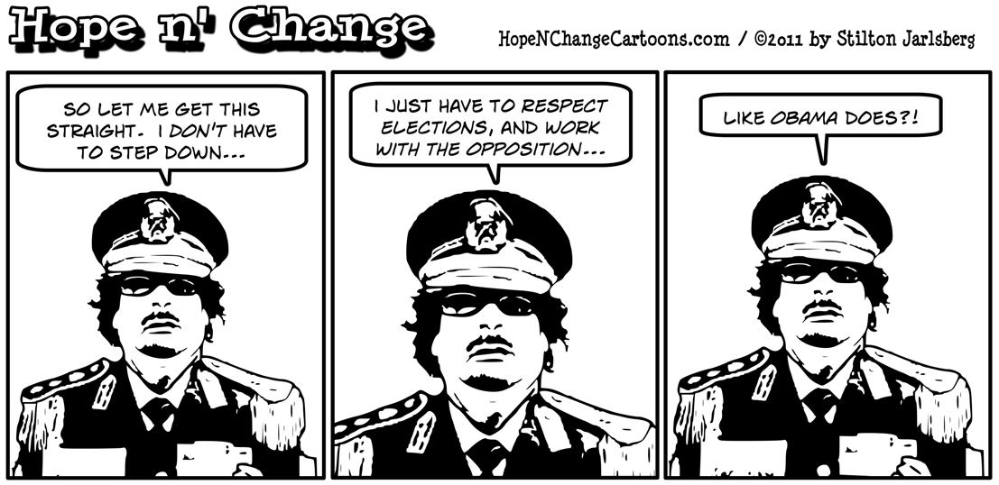 But the reason this is good news for Gadhafi is because if he just follows Obama’s model of "democracy," he won’t really have to change very much to be in compliance!