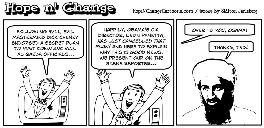 In today’s busy world, people probably don’t stop very often to wonder "what ever happened to Osama bin Laden?" Which is why Hope n’ Change wants to remind you that nothing has happened since this cartoon was posted 2 years ago…and nothing probably will.